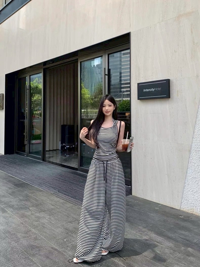 現貨無退換|套裝休閒條紋連帽背心+闊腿長褲