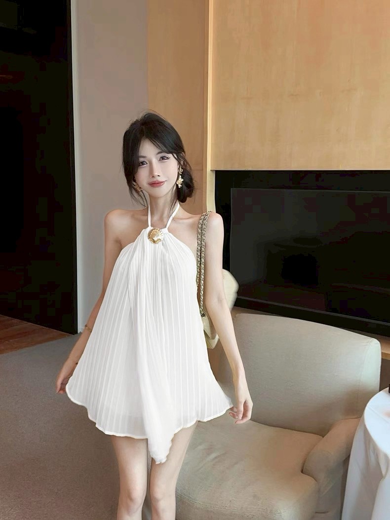 現貨無退換|溫柔浪漫掛脖壓褶連身洋裝