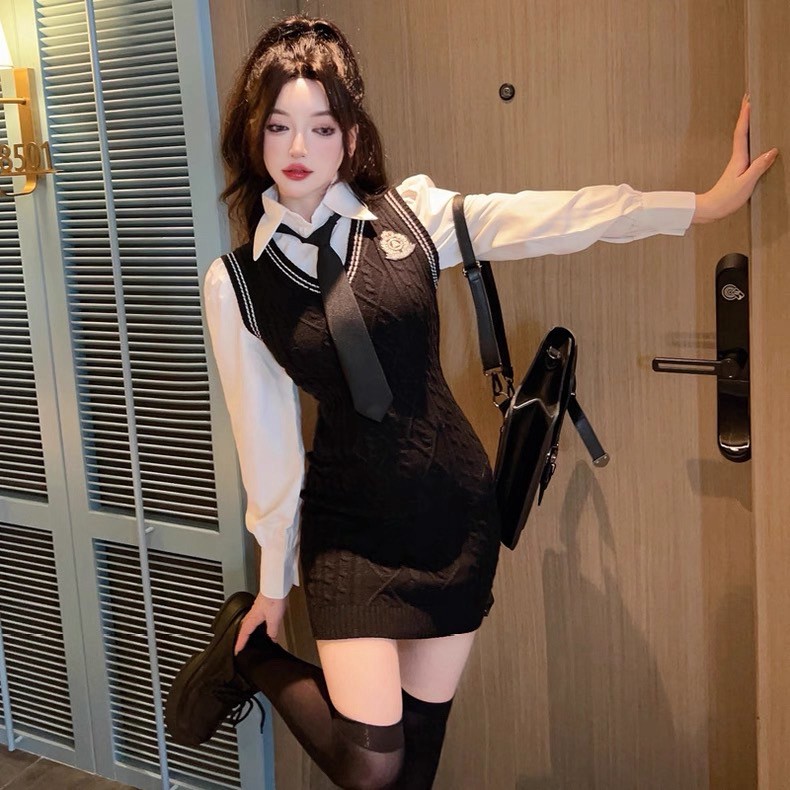 兩件式學院風簡約衫+麻花針織洋