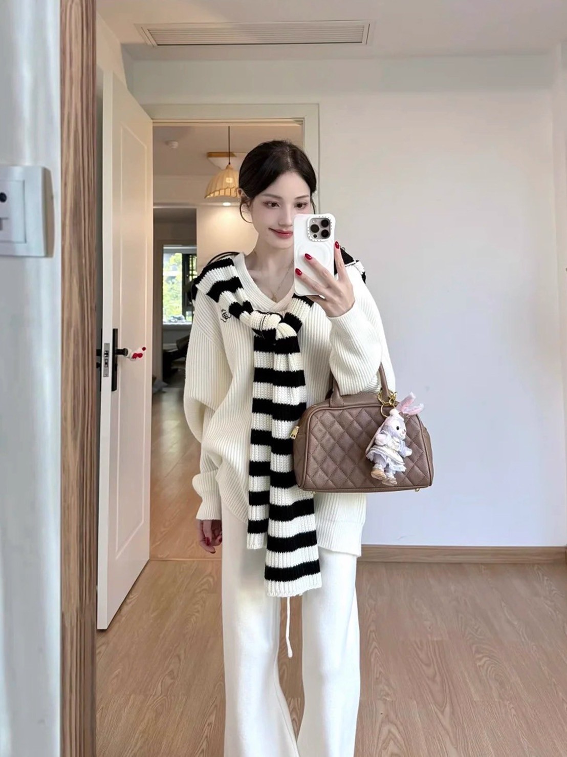 三件套韓妞簡約寬版針織衣+披肩+闊腿褲