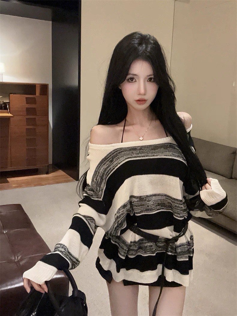 現貨無退換|韓版撞色針織寬鬆腰帶上衣